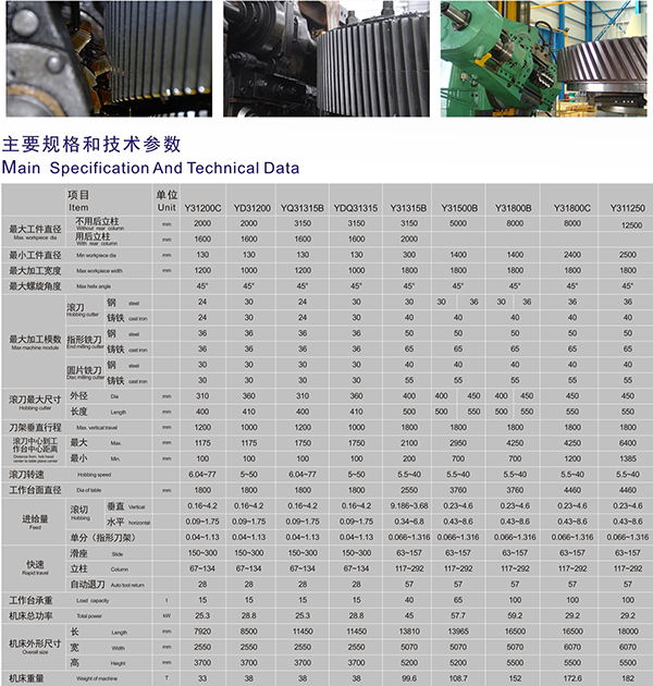 Y31系列機(jī)床適于加工直齒圓柱齒輪、斜齒圓柱齒輪、蝸輪等。使用指形銑刀配合反向機(jī)構(gòu)可以加工無空刀槽的人字齒輪,使用后立柱可加工軸齒輪。